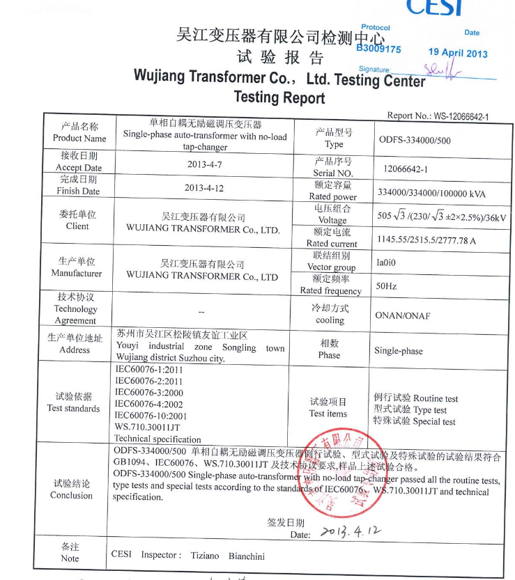 500kV容量334MVA、400 MVA变压器通过国家电器产品质量监督检验中心各项例行、型式及特殊试验;